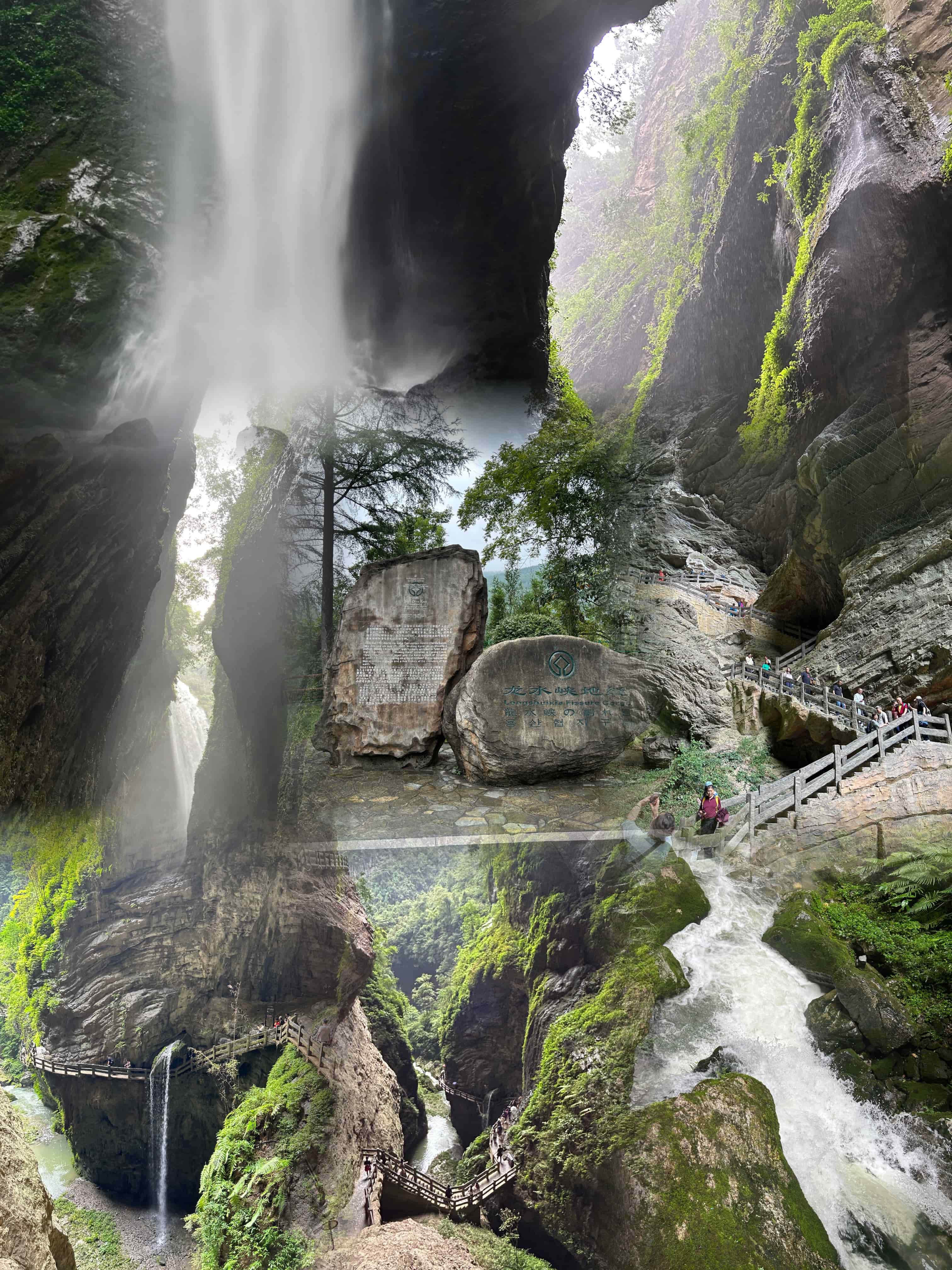 转而来到龙水峡地缝,则步入了一个瀑布轰鸣、绿意盎然的秘境。雨水汇成大小不一的瀑布,或奔涌而下,或如珠帘垂落,击打在栈道旁的岩石与雨伞上,奏响了独一无二的自然乐章。大家沿蜿蜒阶梯徐徐而下,在氤氲水汽中走走停停,用镜头记录下这雨中美景,共同领略了雨中武隆那份雄奇与秀美并存的独特韵味。