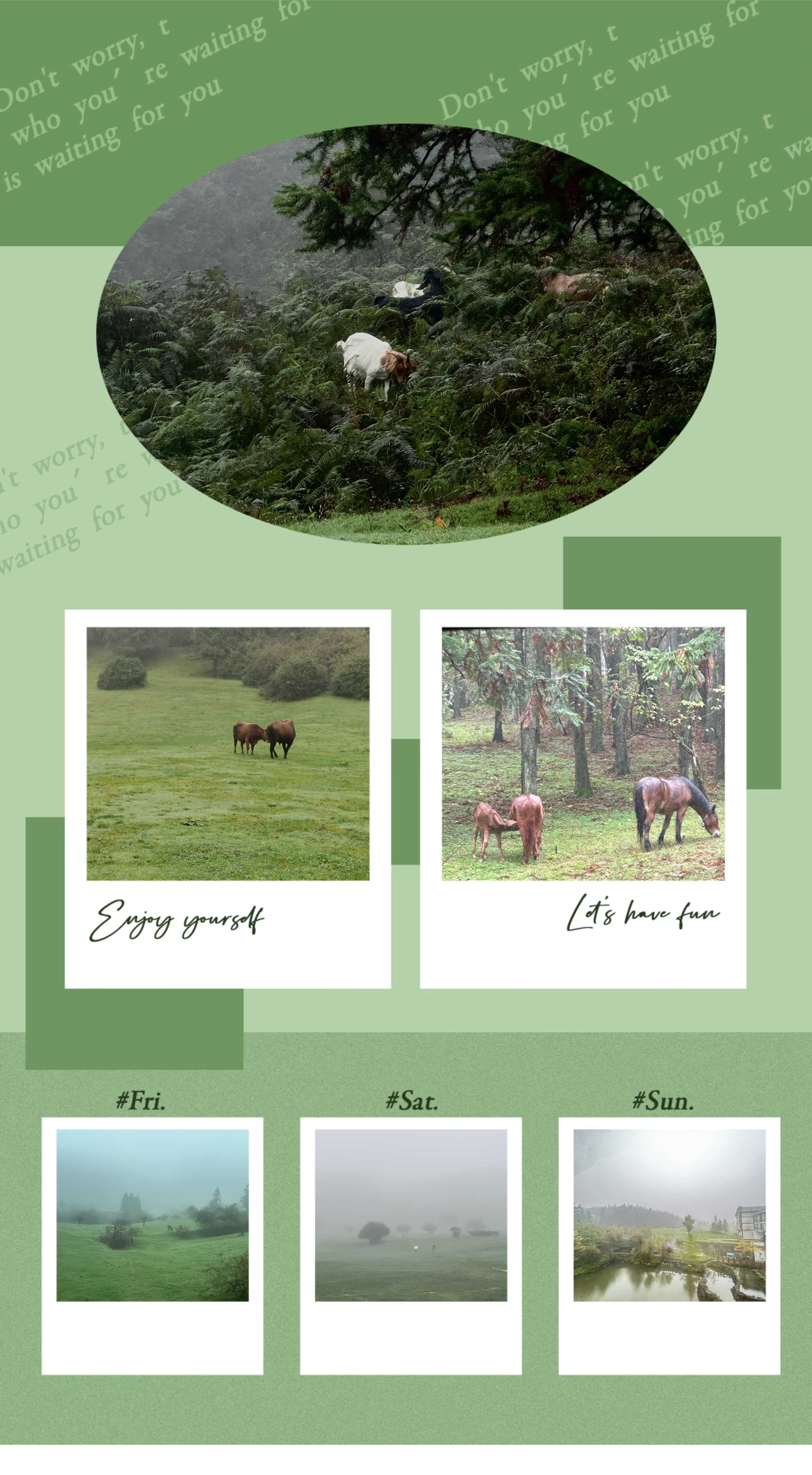 行程第三日,我们入驻仙女山景区,从下榻之处便开启了与自然的对话。清晨醒来,酒店附近悠然散步的羊羔、骏马与黄牛便映入眼帘,它们与远山、薄雾、草甸共同构成了一幅恬静的牧场画卷。大家信步于雾气缭绕的大平原,沉浸在这片自然美景中,深刻感受到人与动物、与环境之间那份难得的和谐与宁静,身心也得到了彻底的放松与治愈。